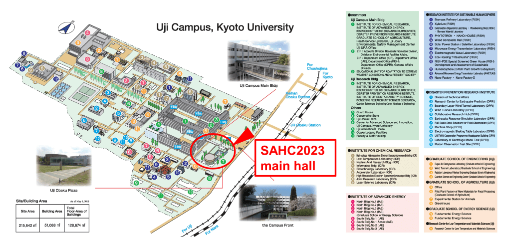 The SAHC2023 conference will be held at Obaku Plaza, Uji Campus, Kyoto University. Uji is another historic city in Kyoto. A 10-minute train from the city centre of Kyoto takes you to Uji. Kyoto University is a world-leading university and is ready to welcome participants from all over world.